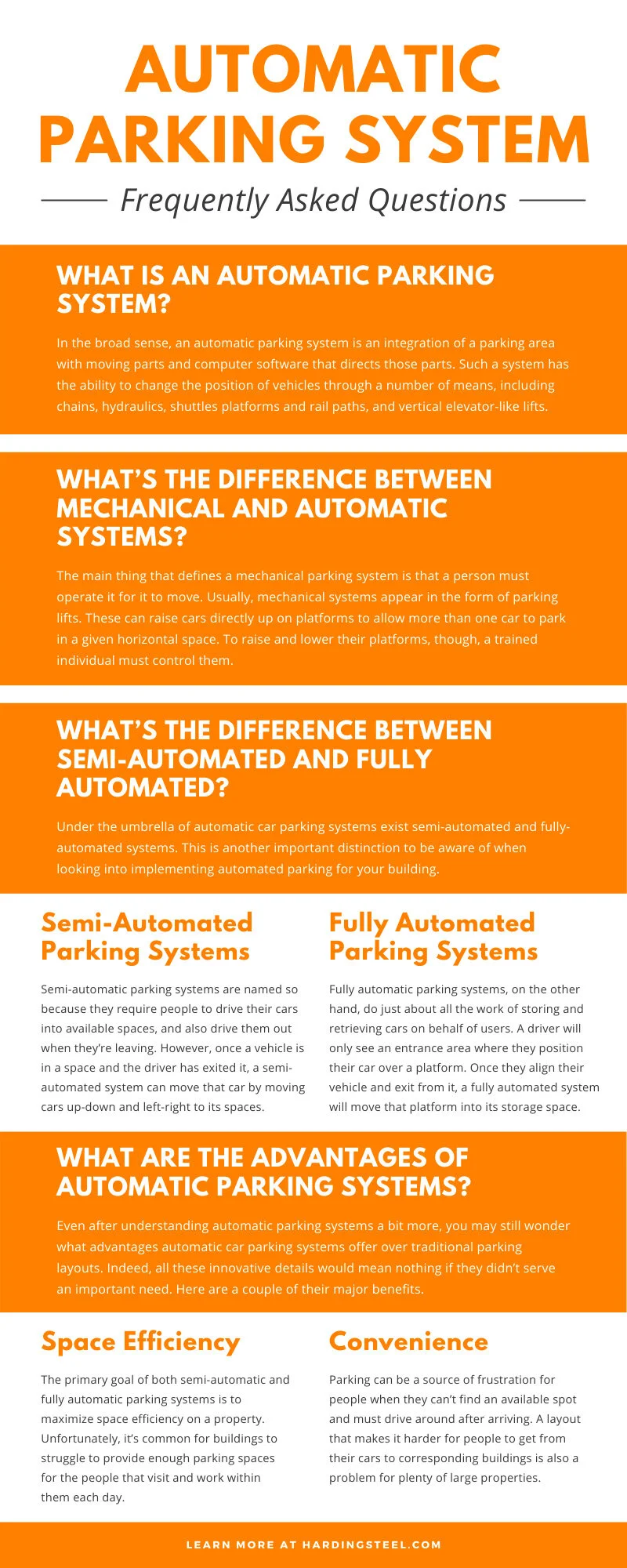 As you can see, automatic parking systems are adaptable to a wide array of places and fulfill highly critical needs for properties. If you have more questions that we didn’t cover in our automatic parking system frequently asked questions, contact Harding Steel today.